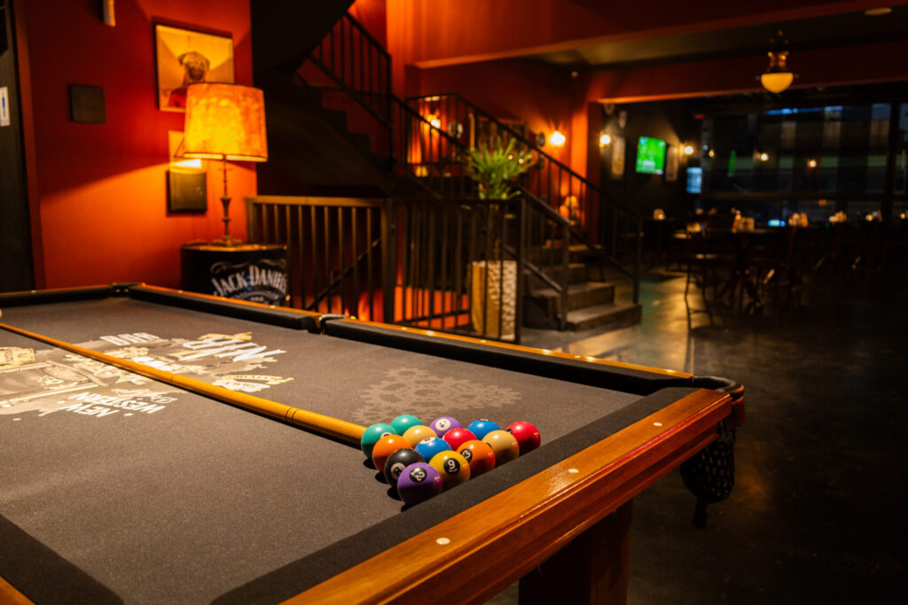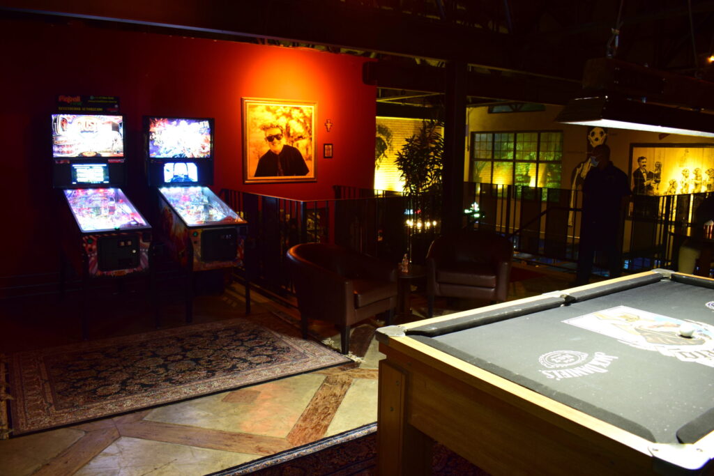 Iluminação baixa, paredes escuras, objetos vintage, madeira, metal, quadros, pôsteres e detalhes gráficos criam um ambiente intimista e cheio de personalidade. O uso constante da figura dos cães, sempre de forma irreverente, aparece em nomes de pratos, artes e elementos decorativos espalhados pela casa.