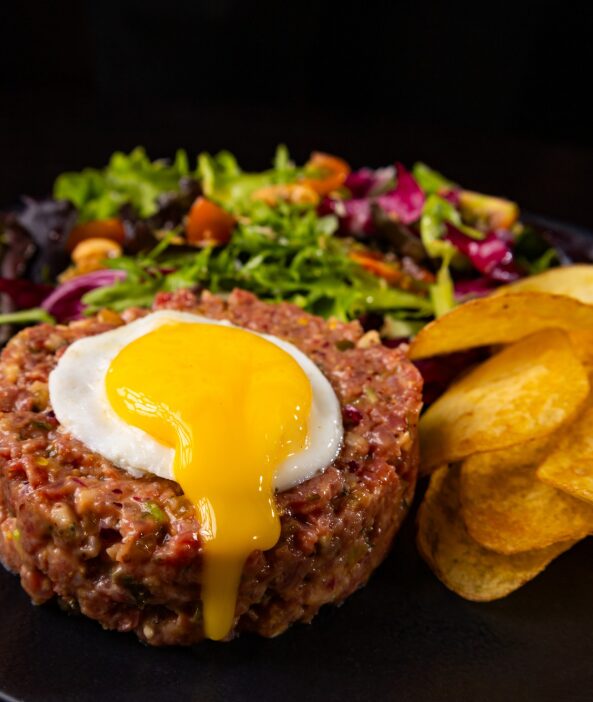 Nas entradas, o cardápio reforça a proposta de compartilhar e experimentar. O Matilha (R$ 44), bolinho cremoso de cupim com pimenta defumada de maracujá, virou um dos queridinhos da casa. O Espeto do Cão (R$ 42), queijo coalho envolto em bacon com melado de cana, traduz bem a irreverência do menu. Já o Rottweiler (R$ 59), steak tartare servido com batata frita, folhas e ovo de codorna frito na manteiga, mostra um lado mais sofisticado da cozinha.