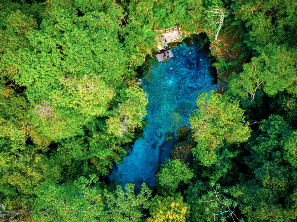 A Nascente Azul, parque que, em 2025, liderou pelo sexto ano consecutivo o ranking de atrativos mais visitados de Bonito, é repleta de atrações voltadas para pessoas de todas as idades, sendo também referência em turismo acessível. Ali, a atividade mais procurada é a flutuação, que começa na nascente que dá nome ao complexo, uma piscina natural com uma rara e intensa tonalidade azul. Mas é ao submergir que a água se revela incrivelmente cristalina, com um grau de visibilidade que supera os 40 metros na horizontal.